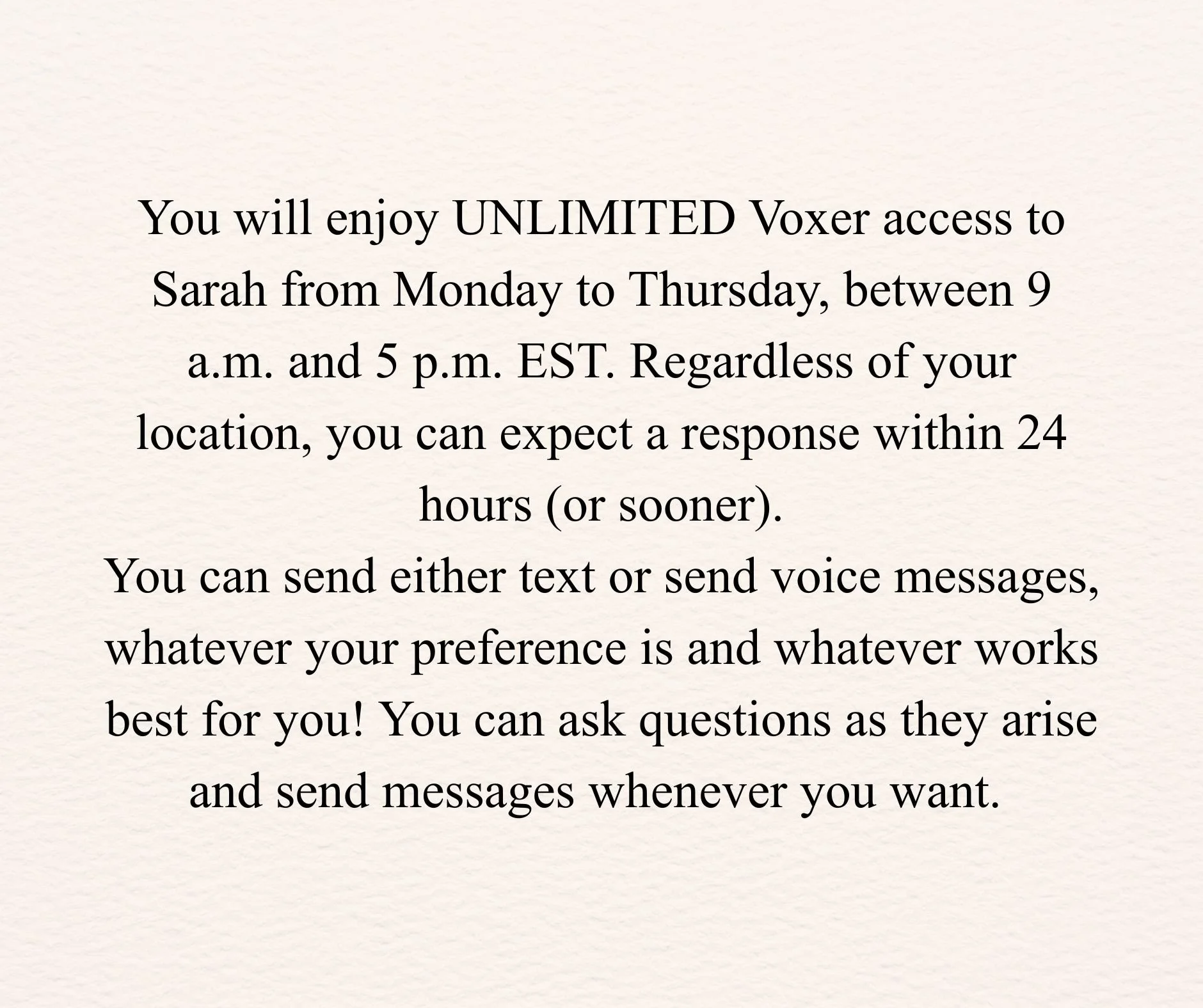 You’re not limited by scheduled meetings. With Voxer, you can connect with me anytime. Whether you have a quick question, need advice, or want to celebrate a win, I’m just a voice message away, ready to support you at every step.